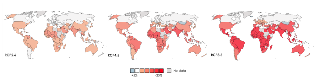 Diagram 1 – Projected impact of rising temperatures on GDP in 2050, following three climate scenarios. Even the most optimistic scenario (RCP2.6, corresponding to a Paris-aligned world) leads to substantial impacts for many countries, especially in Latin America, Africa and Southeast Asia. Almost all countries might be faced with negative impacts, some as early as 2030 [7].